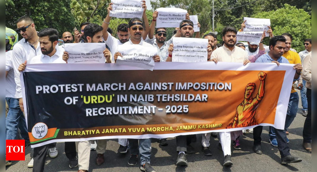JAMMU: BJP legislators on Monday staged a protest outside the civil secretariat in Jammu, demanding revocation of a government order mandating Urdu as a compulsory language for naib tehsildar recruitment examination in Jammu and Kashmir.The MLAs arrived at the secretariat in the morning and staged a dharna, terming the order discriminatory and detrimental to the interests of Jammu’s youth. Carrying placards highlighting injustice against Jammu’s youth, Dogras and other official languages of the Union Territory, they raised slogans against the government and CM Omar Abdullah, accusing his party, National Conference, of trying to create unrest in the region.Speaking to the media, Sunil Sharma said this policy amounted to grave injustice against deserving candidates who are otherwise qualified but are being excluded based on language preference. “This is not just about language; it’s about rights, opportunities and equal treatment. Why should proficiency in Urdu be made mandatory when there are several other official languages in J&K?” he asked.Former minister Sham Lal Sharma said: “Kashmir-centric parties, particularly NC, have been discriminating against the Jammu region for decades. This is a fresh example of it.”Issuing such an order was a clear attempt to deny jobs to Jammu’s youth, he alleged. “We are holding protests to get it revoked. Youth are already on the streets protesting. The matter has been brought to the notice of the lieutenant governor as well, and memorandums have been submitted through deputy commissioners, but nothing has been done so far,” he said.Sharma said 14 BJP MLAs had even met CM Omar on the issue. “His approach was positive, but no action has been taken yet, and tomorrow is the last day to apply for the posts. They are trying to create unrest in Jammu and are forcing us to go on agitation,” he added.“We are warning the government not to play with the sentiments of the people of Jammu, who are fed up with the discriminatory attitude of Kashmir-centric rulers,” he said.