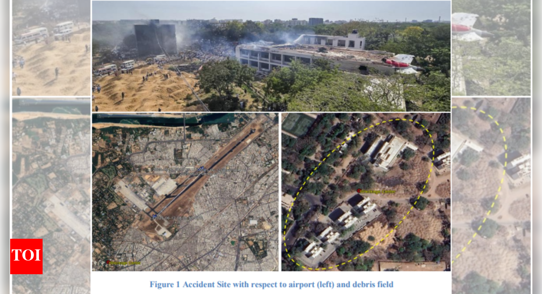 NEW DELHI: The crash of Air India flight AI 171 on June 12 has been traced back to a sudden and unexplained fuel cutoff to both engines just three seconds after takeoff from Ahmedabad, the Aircraft Accident Investigation Bureau (AAIB) has revealed in its preliminary report. The report, released Saturday, includes a detailed timeline of the final moments of the London-bound Dreamliner, supported by critical images showing the impact trail, wreckage, and damage to key aircraft components.Images included in the report capture the dramatic descent of the Boeing 787 as it clipped treetops, an incineration chimney, and then collided with the BJ Medical College hostel building just 1.6 km from the runway. The aircraft, weighing 213.4 tons—nearly its maximum takeoff weight—never gained sufficient altitude after lift-off.“The aircraft achieved maximum recorded airspeed of 180 knots… and immediately thereafter, the engine 1 and engine 2 fuel cutoff switches transitioned from RUN to CUTOFF position one after another with a time gap of one second,” the report states. This caused both engine fan rotation speeds (N1 and N2) to fall below minimum idle, deploying the Ram Air Turbine (RAT), as captured in airport CCTV footage.