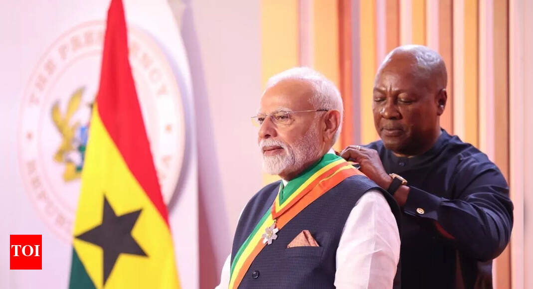 NEW DELHI: Prime Minister Narendra Modi on Wednesday (local time) was conferred with ‘The Officer of the Order of the Star of Ghana’ and said that this honour is a responsibility, to keep working towards a stronger India-Ghana friendship. In his acceptance speech, Modi said the award was a matter of great pride and honour for him and dedicated it to the aspirations and bright future of the youth of the two countries, the historical ties between Ghana and India, and their rich cultural traditions and diversity.In a post on X, PM Modi said, “I thank the people and Government of Ghana for conferring ‘The Officer of the Order of the Star of Ghana’ upon me. This honour is dedicated to the bright future of our youth, their aspirations, our rich cultural diversity and the historical ties between India and Ghana.”Ghana President John Mahama presented the award.“This honour is also a responsibility; to keep working towards stronger India-Ghana friendship. India will always stand with the people of Ghana and continue to contribute as a trusted friend and development partner,” he added. The award was presented during PM Modi’s visit to Ghana, the first by an Indian Prime Minister in more than 30 years. BJP IT cell chief Amit Malviya said that PM Modi has been conferred with 24 global awards including the countries from Palestine and Russia.“This prestigious recognition reflects not only PM Modi’s global leadership but also India’s rising stature on the world stage under his visionary guidance,” Malviya said in a post on X.The award was conferred on the prime minister in recognition of his “distinguished statesmanship and influential global leadership,” the MEA said in a press release.Thanking the people and government of Ghana for the special gesture, the prime minister noted that the “shared democratic values and traditions of the two countries would continue to nurture the partnership”.He said the award “further deepens the friendship between the two countries and places new responsibility on him to embrace and advance bilateral ties.”