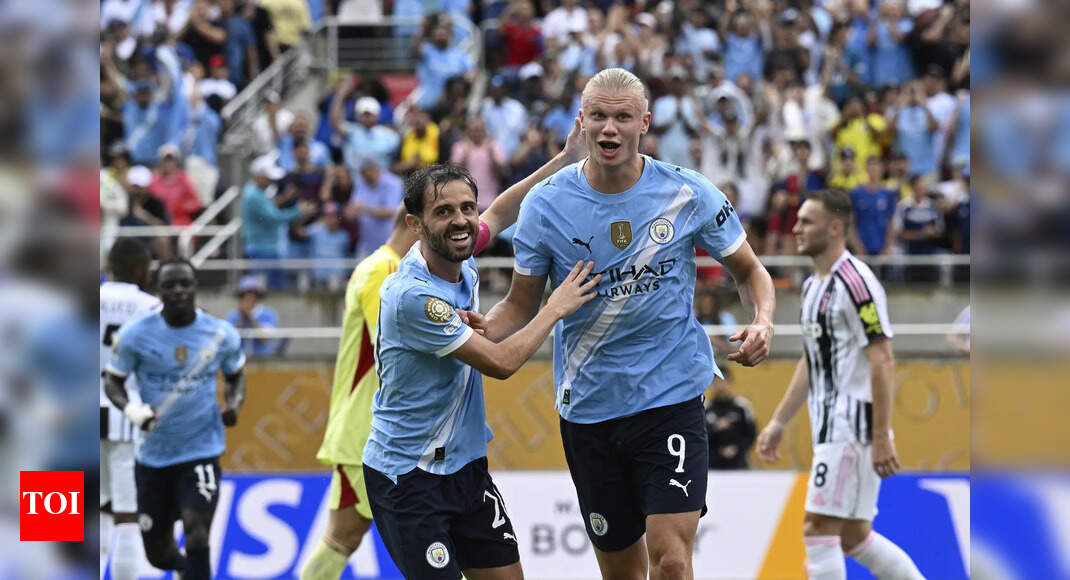 Manchester City’s Erling Haaland, right, celebrates with teammate Bernardo Silva after scoring his side’s third goal during the Club World Cup Group G soccer match between Juventus and Manchester City in Orlando, Fla., Thursday, June 26, 2025. (AP Photo/Phelan Ebenhack)